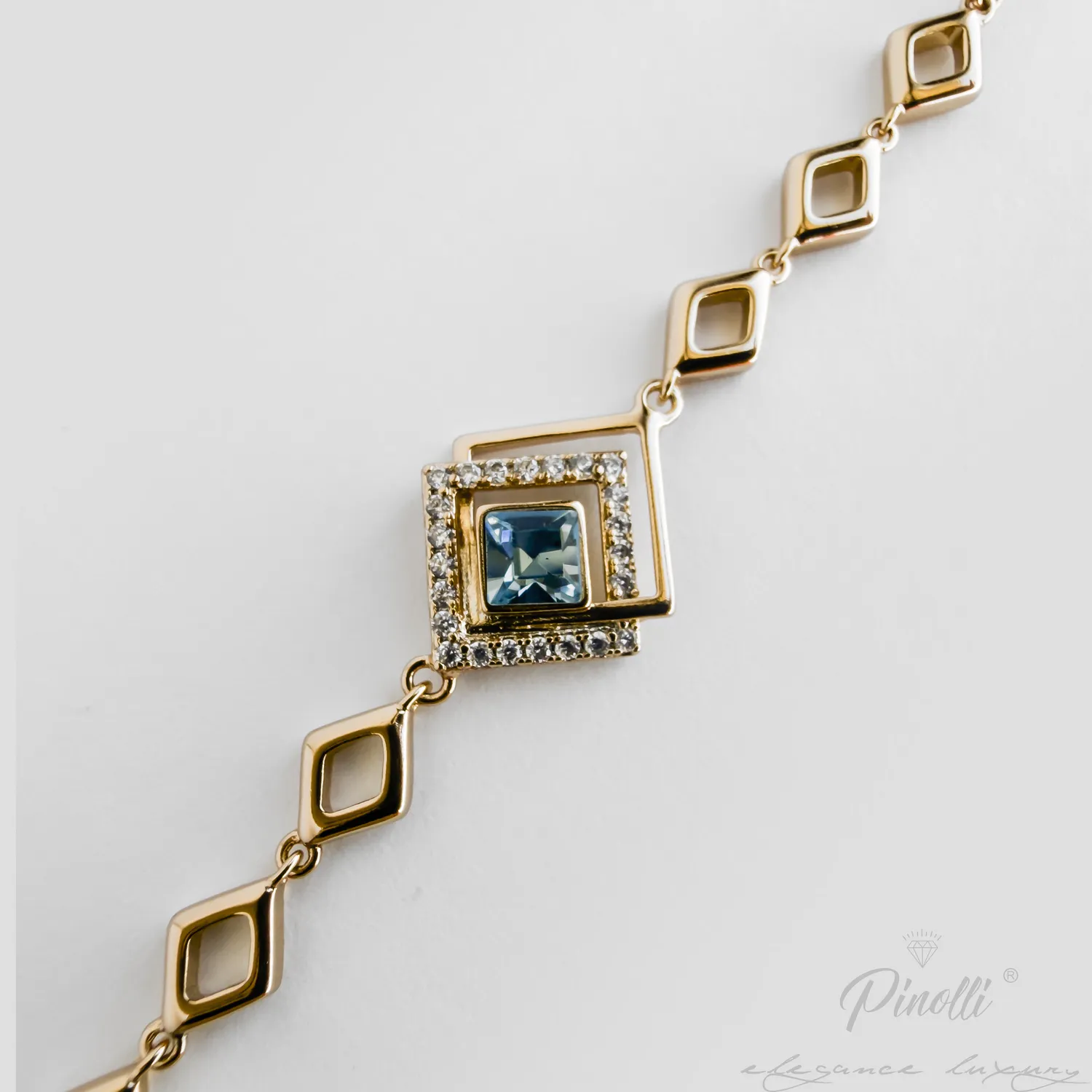 Brățara Golden Azure Frame îmbină liniile geometrice curate cu profunzimea unui cristal albastru intens, montat central într-un cadru delicat pavé. Elementele rombice creează un ritm vizual sofisticat, iar finisajul auriuadaugă căldură și eleganță.