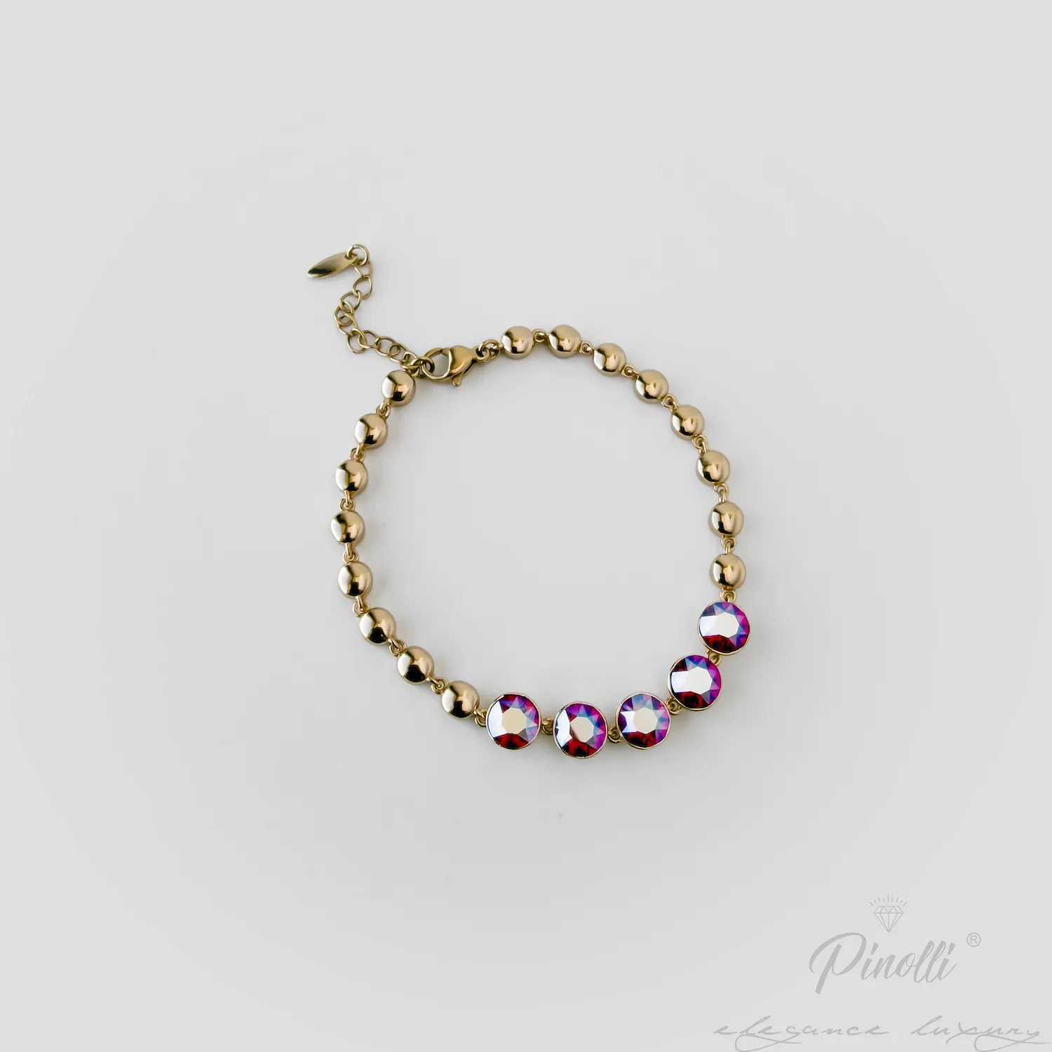 Brățara Pink Radiant îmbină eleganța aurului cald cu reflexii intense de albastru și verde, creând un contrast sofisticat și luminos. Cristalele captează lumina la fiecare mișcare, iar elementele rotunde oferă un echilibru armonios și feminin.